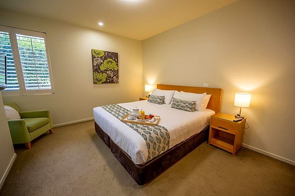 This spacious room features 1 bedroom and bathroom with a spa bath and separate shower. There is a separate dining area and a designer kitchen with full cooking facilities. Guests can enjoy a two-way open fireplace between the living and dining ares. A parking space is included beside the room.